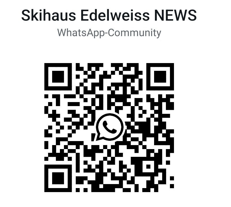 Möchtest du stets aktuell über unsere Öffnungszeiten informiert sein? Dann melde dich einfach auf der WhatsApp-Community „Skihaus-Edelweiss NEWS“ an, indem du mit deinem Handy den QR-Code scannst oder in der Mobilen Ansicht diesen Link öffnest.